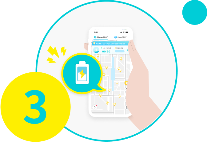返すときはお近くのバッテリースタンドの空きスロットにモバイルバッテリーを差し込んでください。空きスロットのあるスポットはアプリから検索できます。